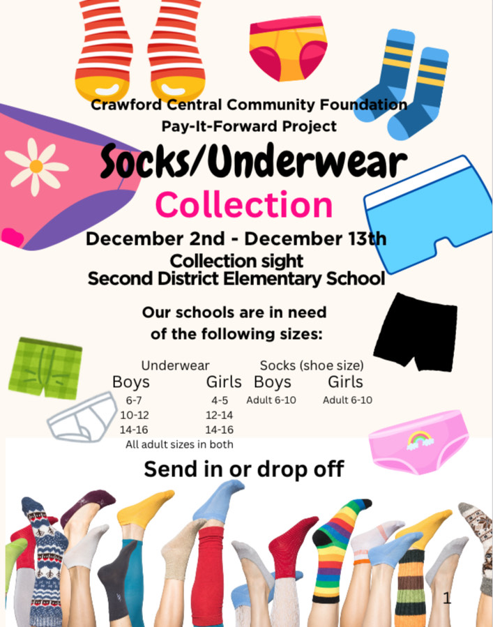 Another great “Pay It Forward” Project from a 2024 Fall Grant recipient. Please consider donating socks and underwear (sizes listed below) for the Crawford Central Elementary Schools with the drop off point at Second District Elementary School. Thank You Julie Clements for your CCCF Grant Application to purchase Sensory Items for students on the spectrum.